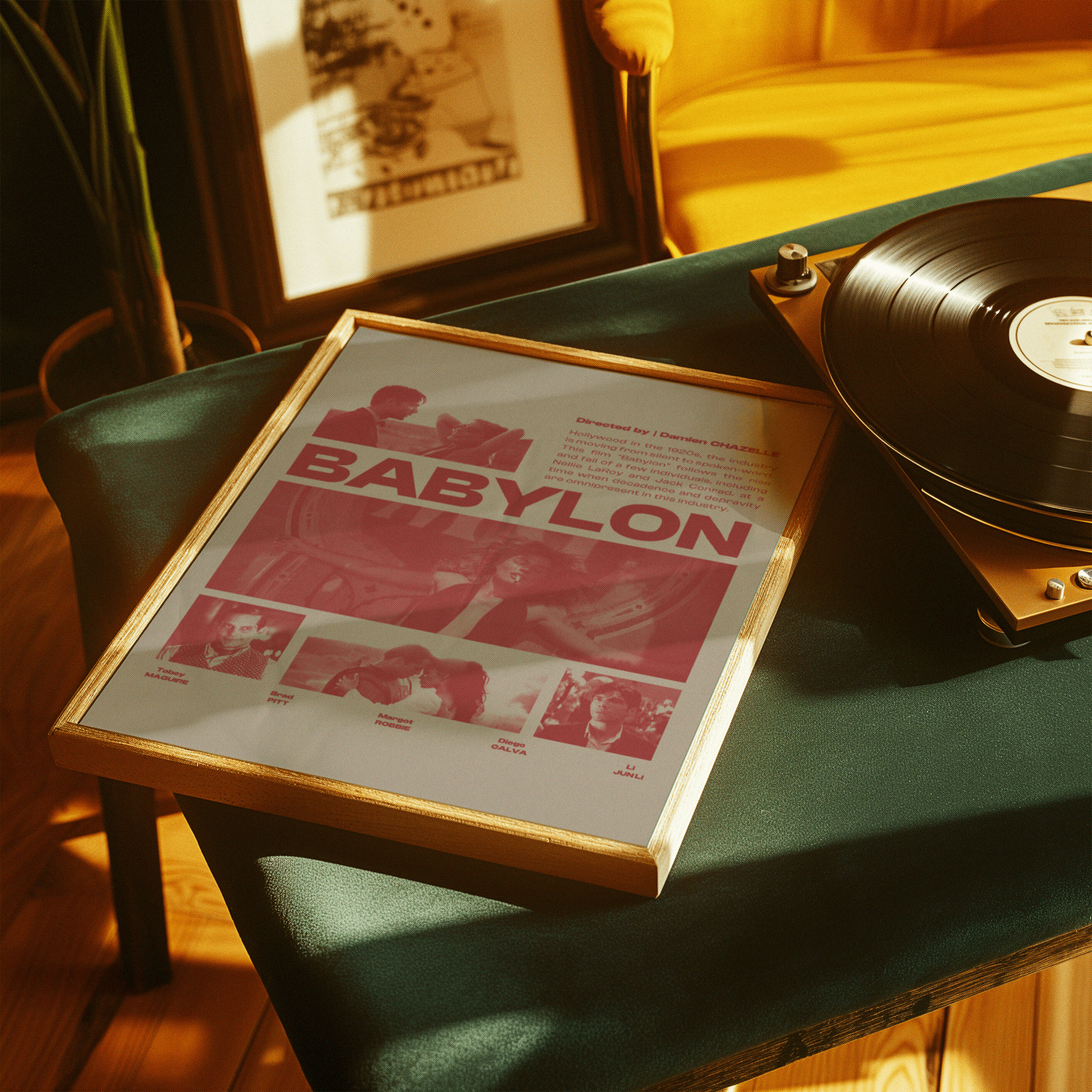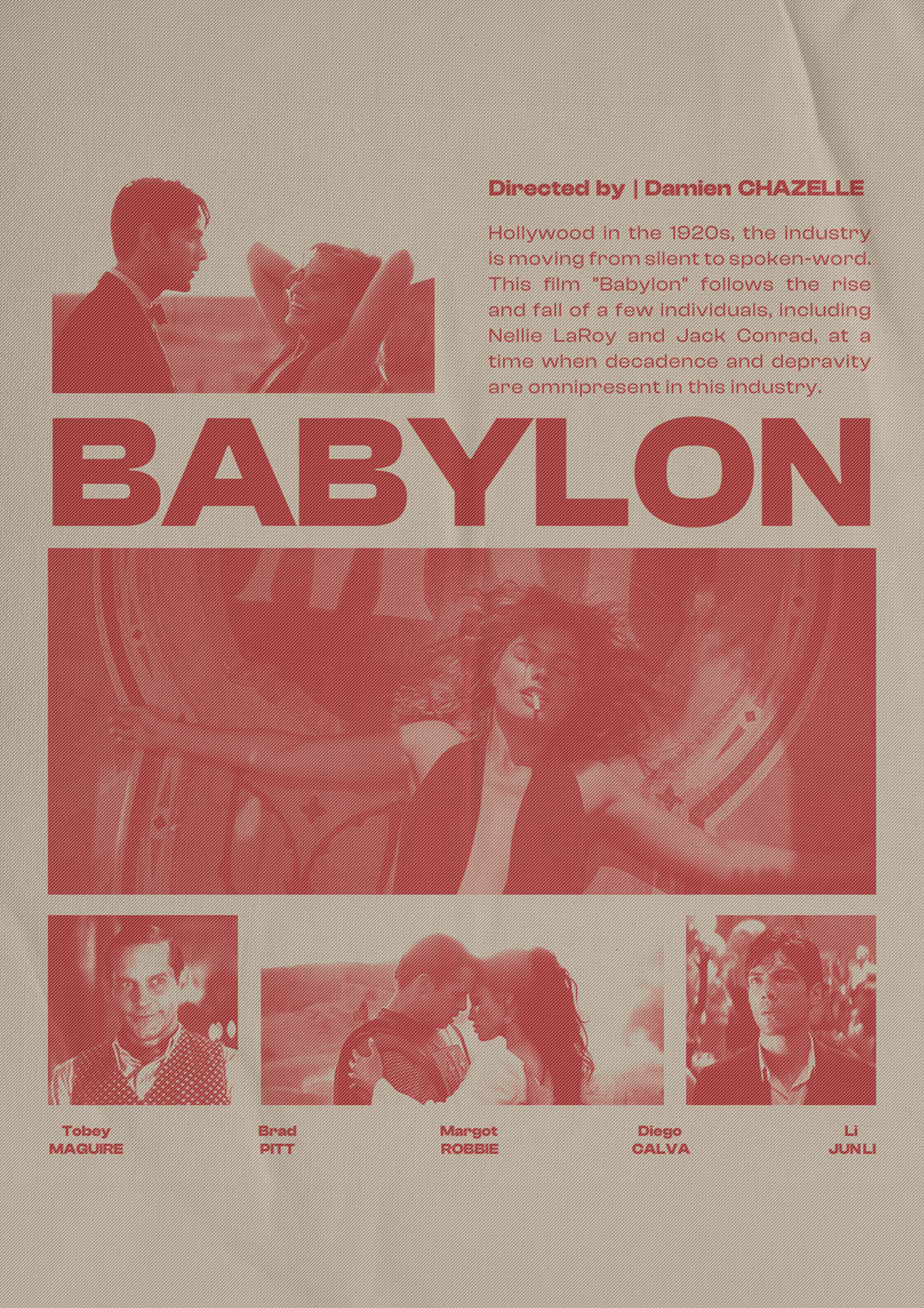 Ce poster pour le film Babylon utilise une palette monochrome rouge qui évoque à la fois l’intensité et l’énergie du cinéma des années 1920, période durant laquelle l’industrie du film se transforme radicalement. Le design est centré autour du titre « BABYLON », écrit en lettres massives, capturant l’essence du film qui parle de l’excès et de l’ascension fulgurante des personnages principaux, notamment Nellie LaRoy et Jack Conrad.