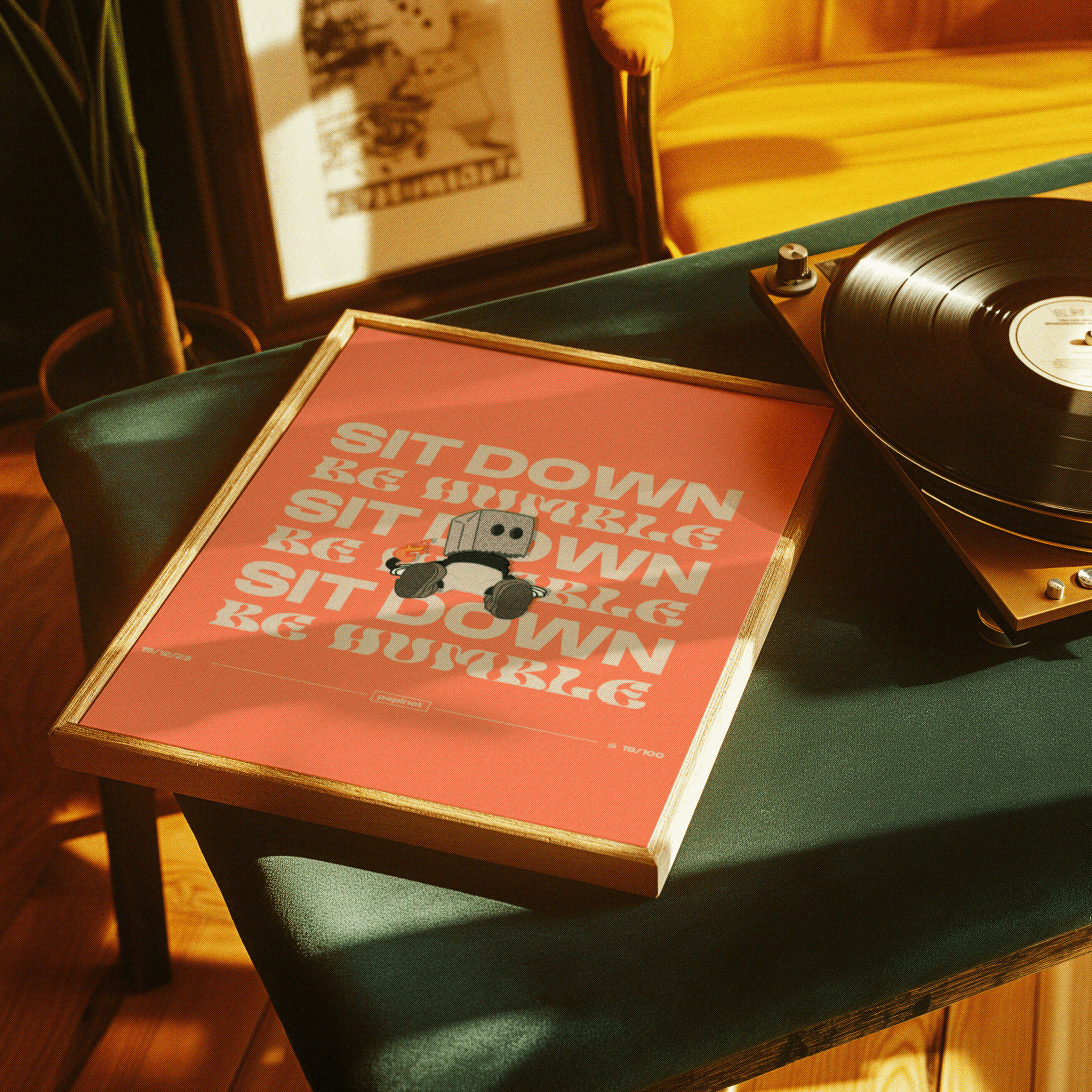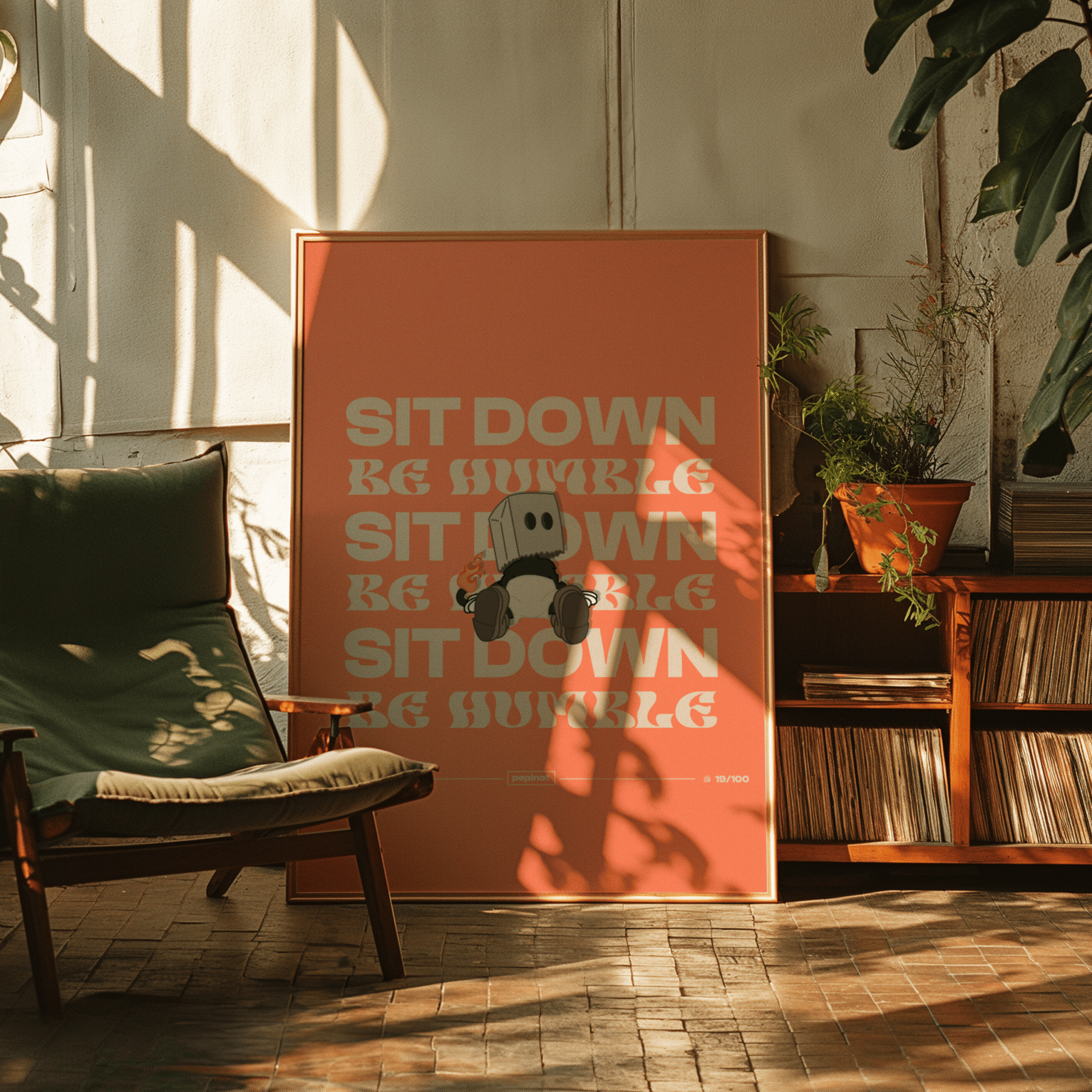 Ce poster minimaliste et audacieux met en avant un personnage stylisé, un petit démon portant une boîte sur la tête, dans une posture détendue. L’illustration est centrée sur le message « SIT DOWN, BE HUMBLE », répété plusieurs fois en arrière-plan avec une typographie rétro et énergique. Le personnage, visiblement apaisé, est en contraste avec le texte affirmatif et dynamique, créant un effet visuel amusant et décalé. Le petit démon, avec une flamme surgissant de son dos, incarne un côté irrévérencieux tout en étant ancré dans une posture de calme et d’humilité. Le fond orange vif et la simplicité de la composition renforcent le côté ludique et direct de ce poster, qui porte un message subtil de calme et de modestie.