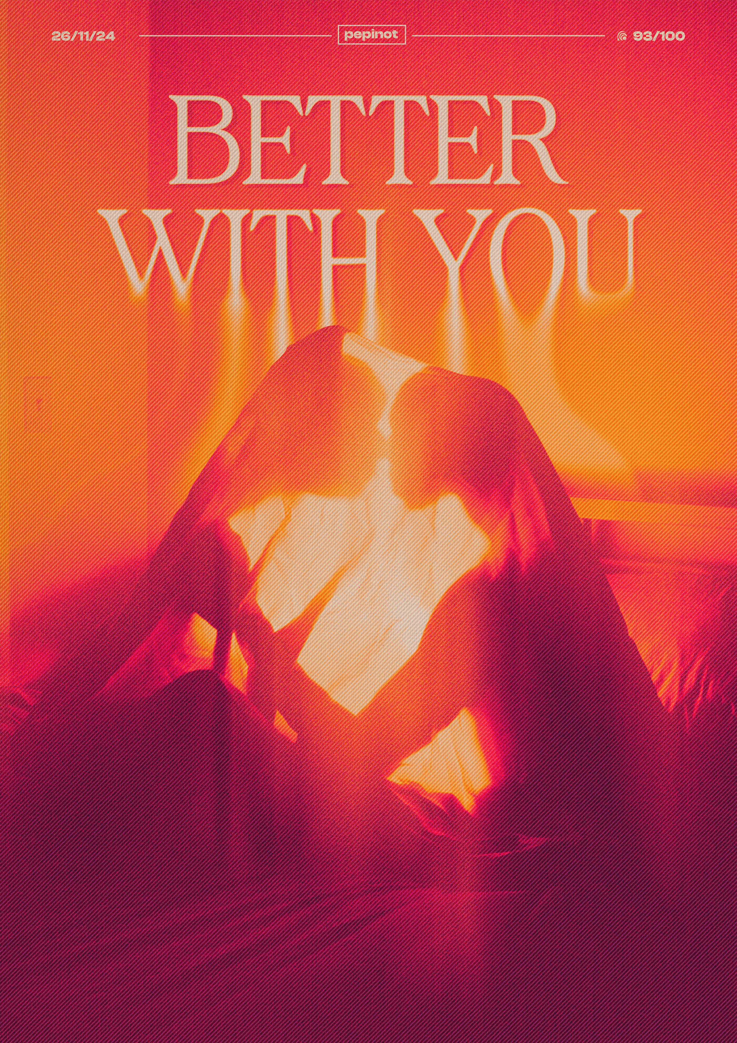 Ce poster célèbre la beauté d’une relation amoureuse en reprenant la phrase emblématique du morceau Music Sounds Better With You. L’image centrale met en scène un couple intime, leurs silhouettes floues entrelacées sous un voile, capturant l’idée de connexion profonde. Le fond dégradé, allant du rouge vif à l’orange, intensifie l’émotion et crée une atmosphère chaleureuse et intime. La typographie, large et élégante, accentue le message, tandis que l’effet visuel de flou renforce la notion de proximité et de passion partagée. Le design évoque à la fois l’intensité et la beauté d’une relation où tout semble meilleur à deux.