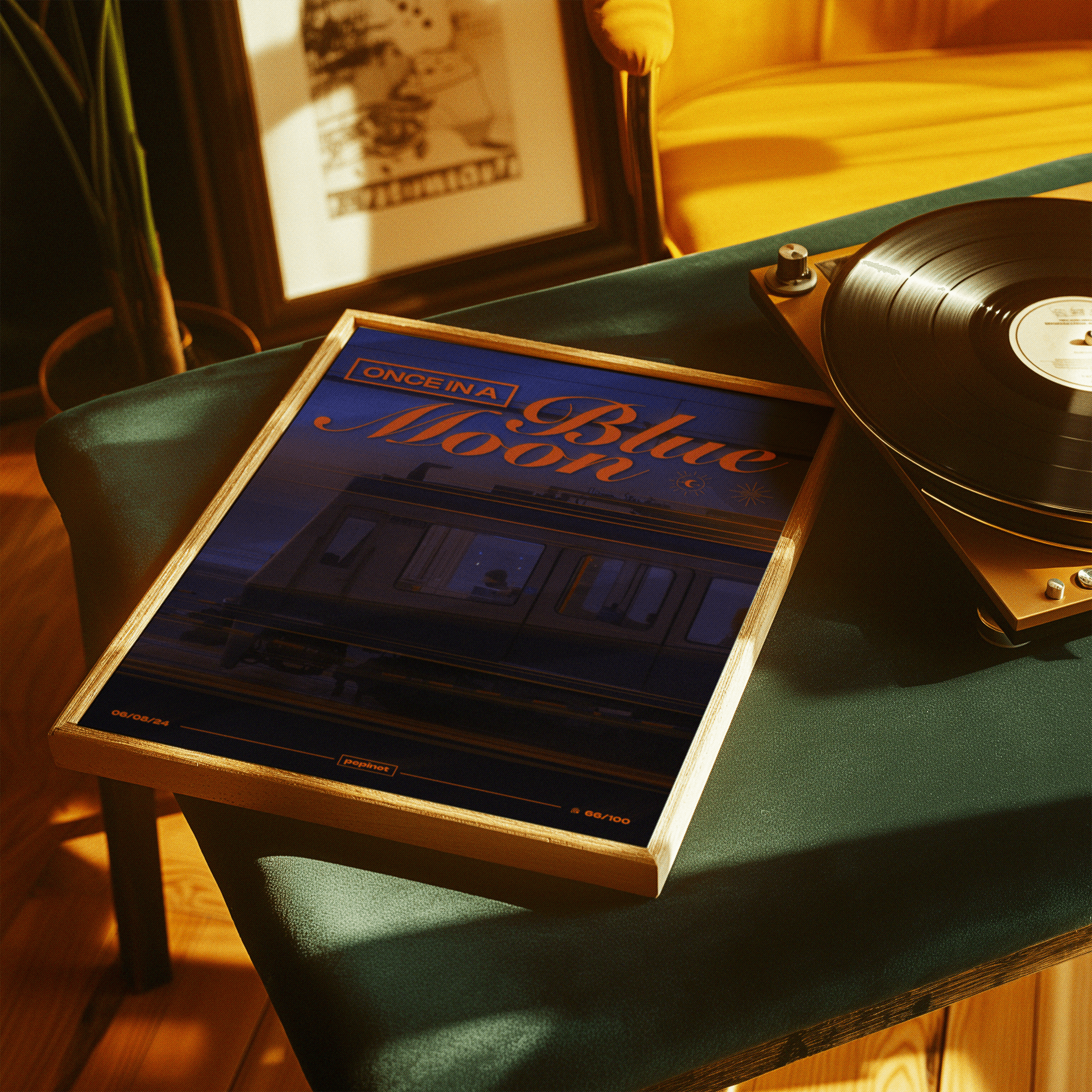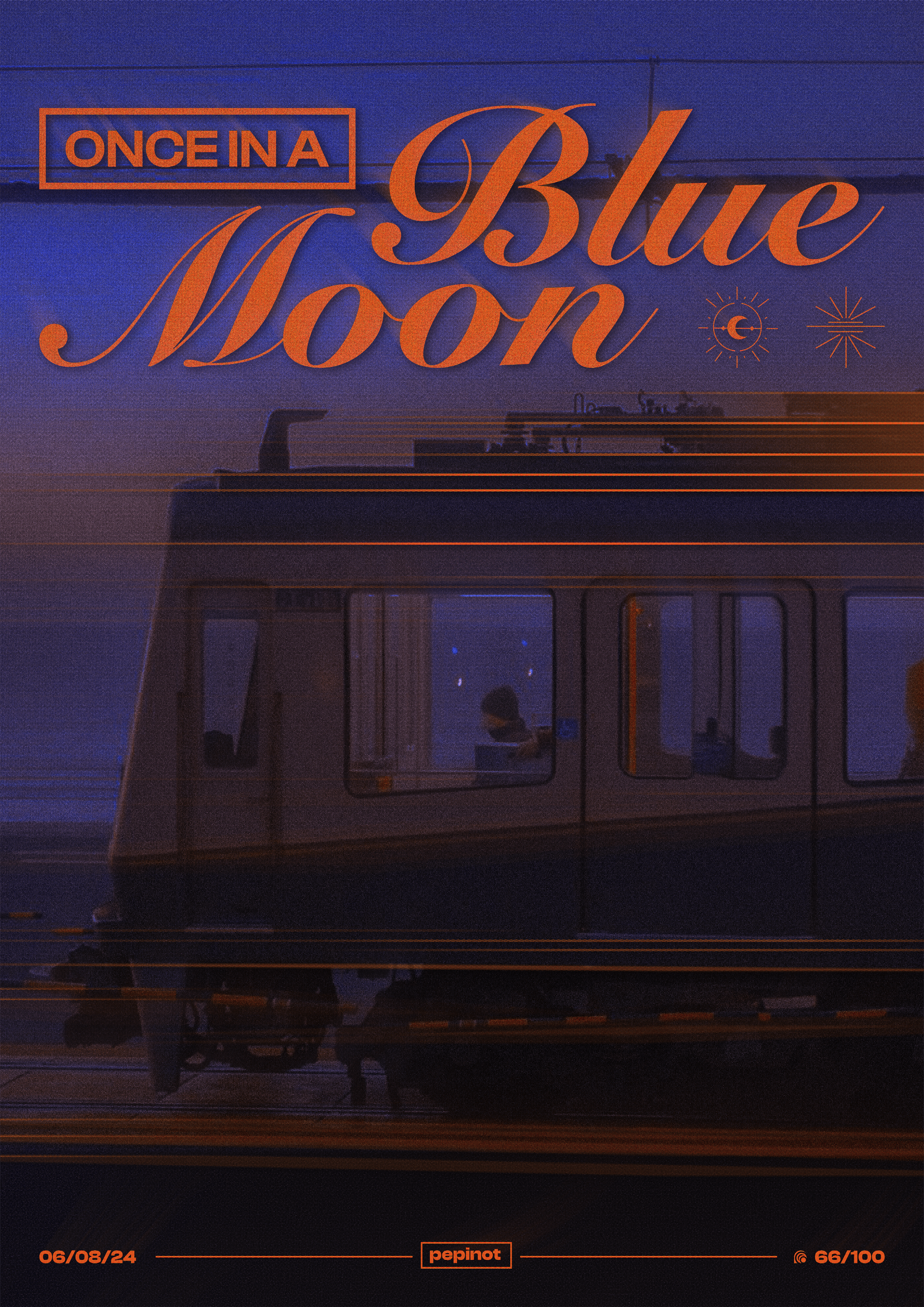 Le poster joue sur une ambiance nocturne, avec une palette de couleurs bleues et oranges qui évoque un moment particulier, rare comme un « Blue Moon ». La typographie fluide et élégante du texte « Once in a Blue Moon » contraste avec la scène de métro floue, créant une dynamique visuelle captivante. Le numéro 66/100 rappelle le challenge des 100 posters.