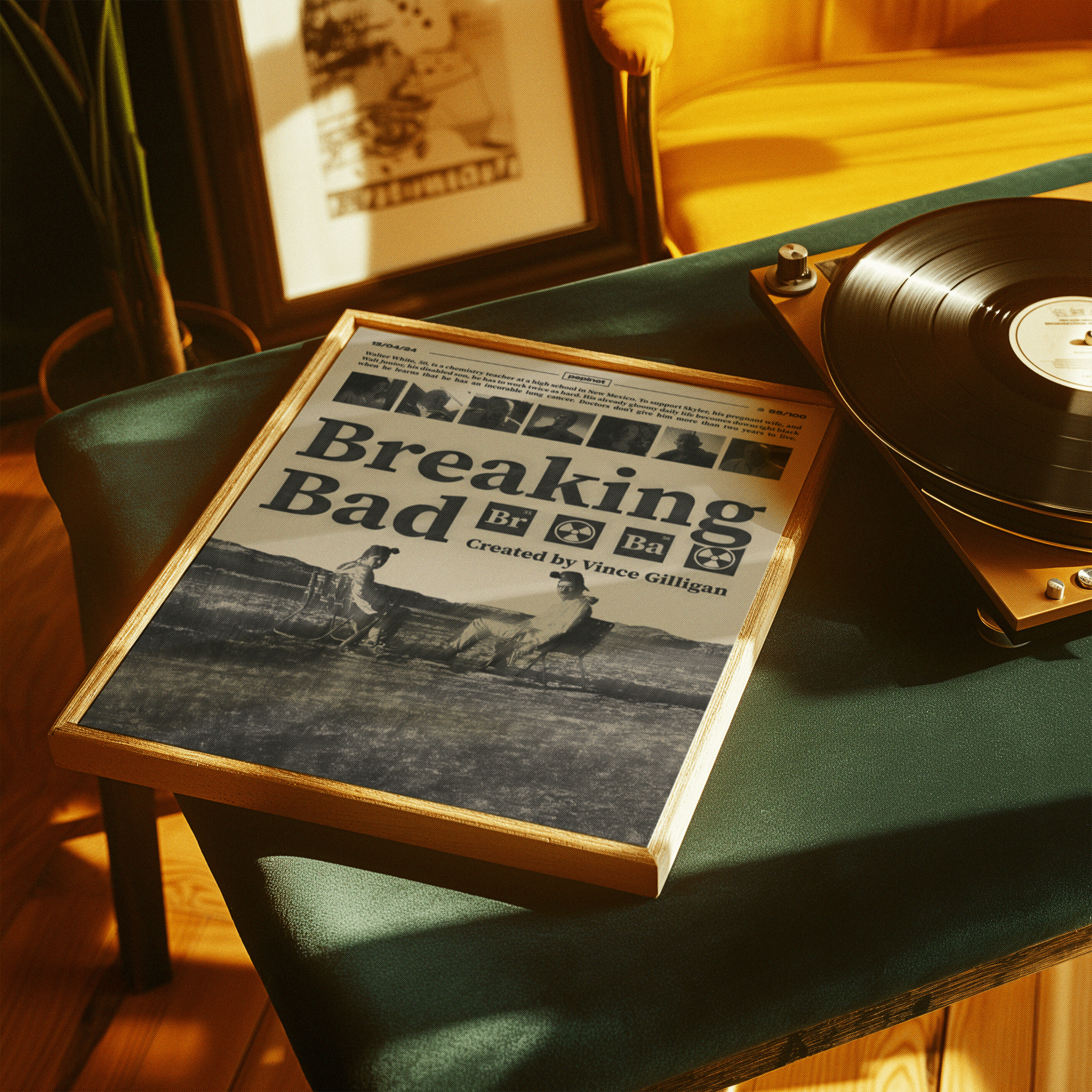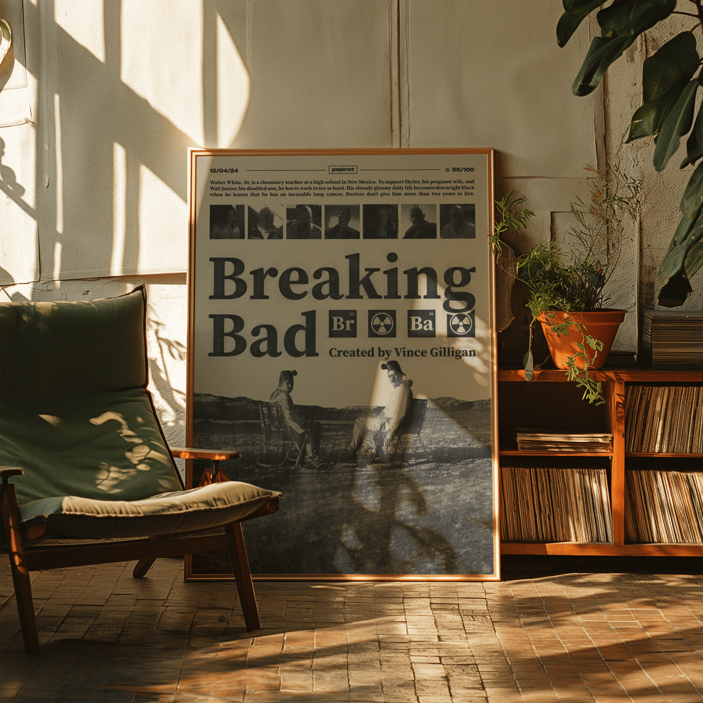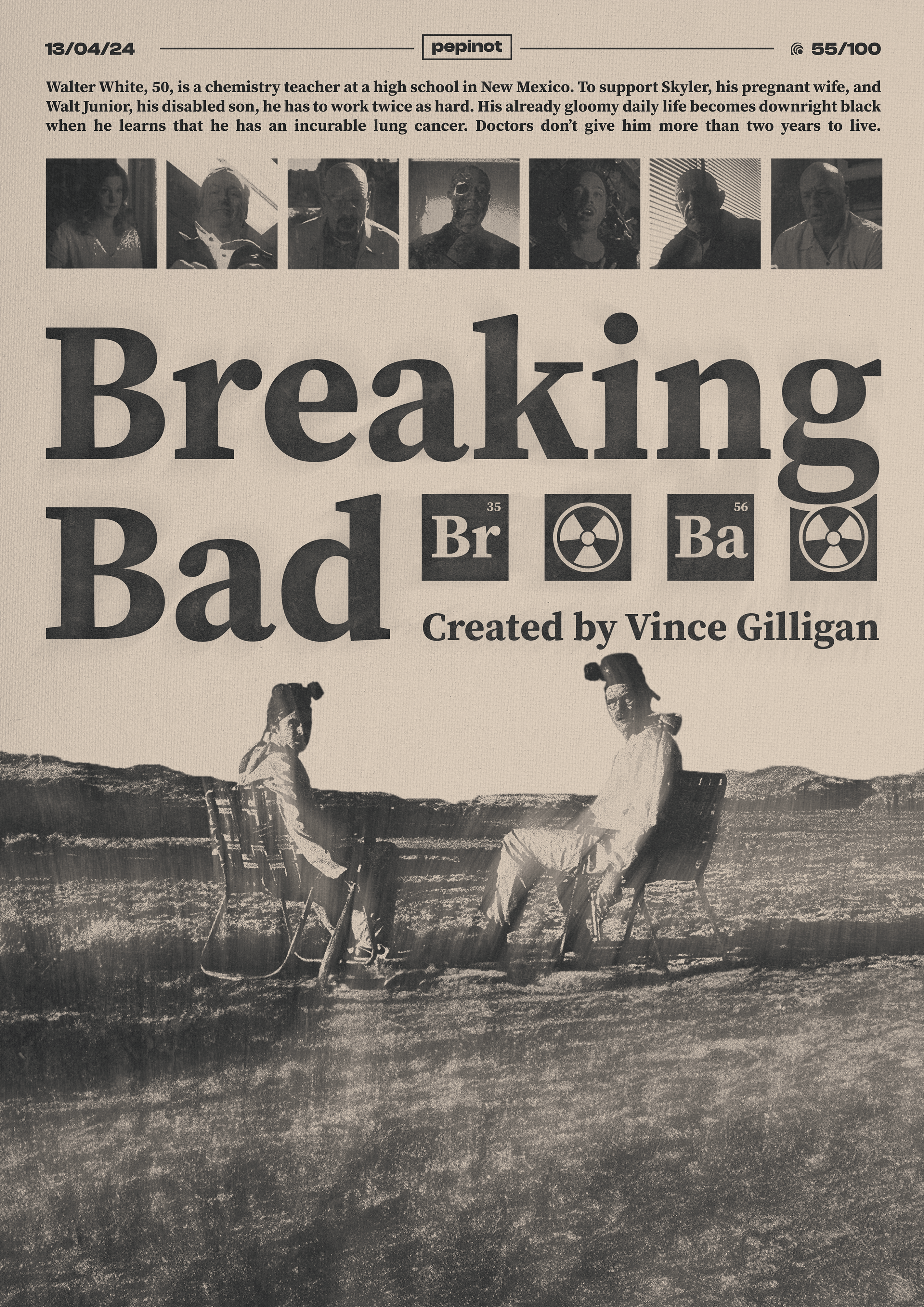 Ce 55ème poster de mon challenge créatif met en avant l’emblématique série « Breaking Bad ». Le titre, en typographie audacieuse, est accompagné des éléments chimiques « Br » et « Ba », représentant le brome et le baryum, qui font référence aux personnages de Walter White et de son alter ego, Heisenberg. En arrière-plan, une scène marquante avec Walter White et Jesse Pinkman assis dans le désert, capturant l’essence de la série, avec leur combinaison jaune et leurs masques, symbolisant leur plongée dans le crime. Le fond, traité en noir et blanc, accentue l’atmosphère sombre et tendue du show. Le texte en bas présente le créateur de la série, Vince Gilligan.