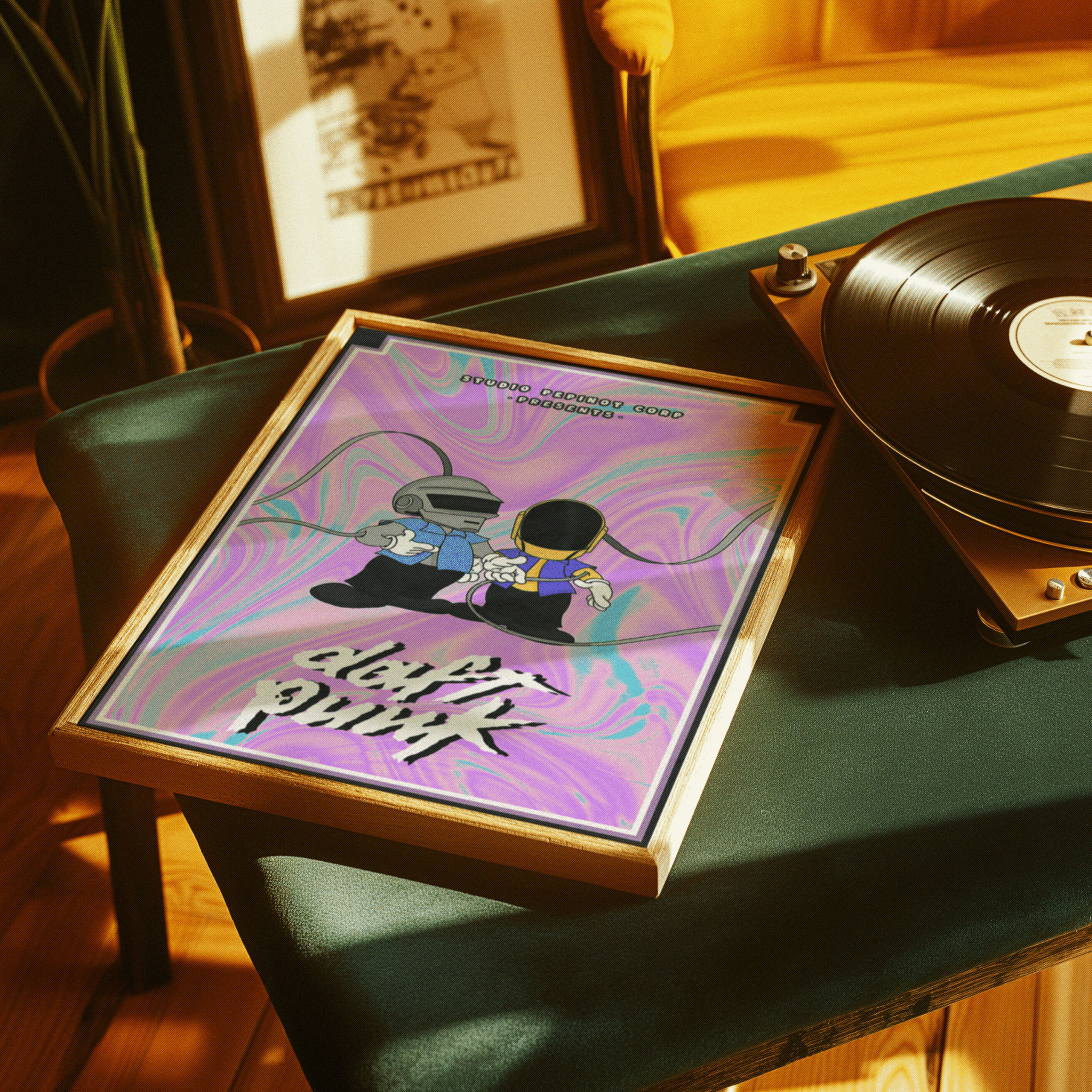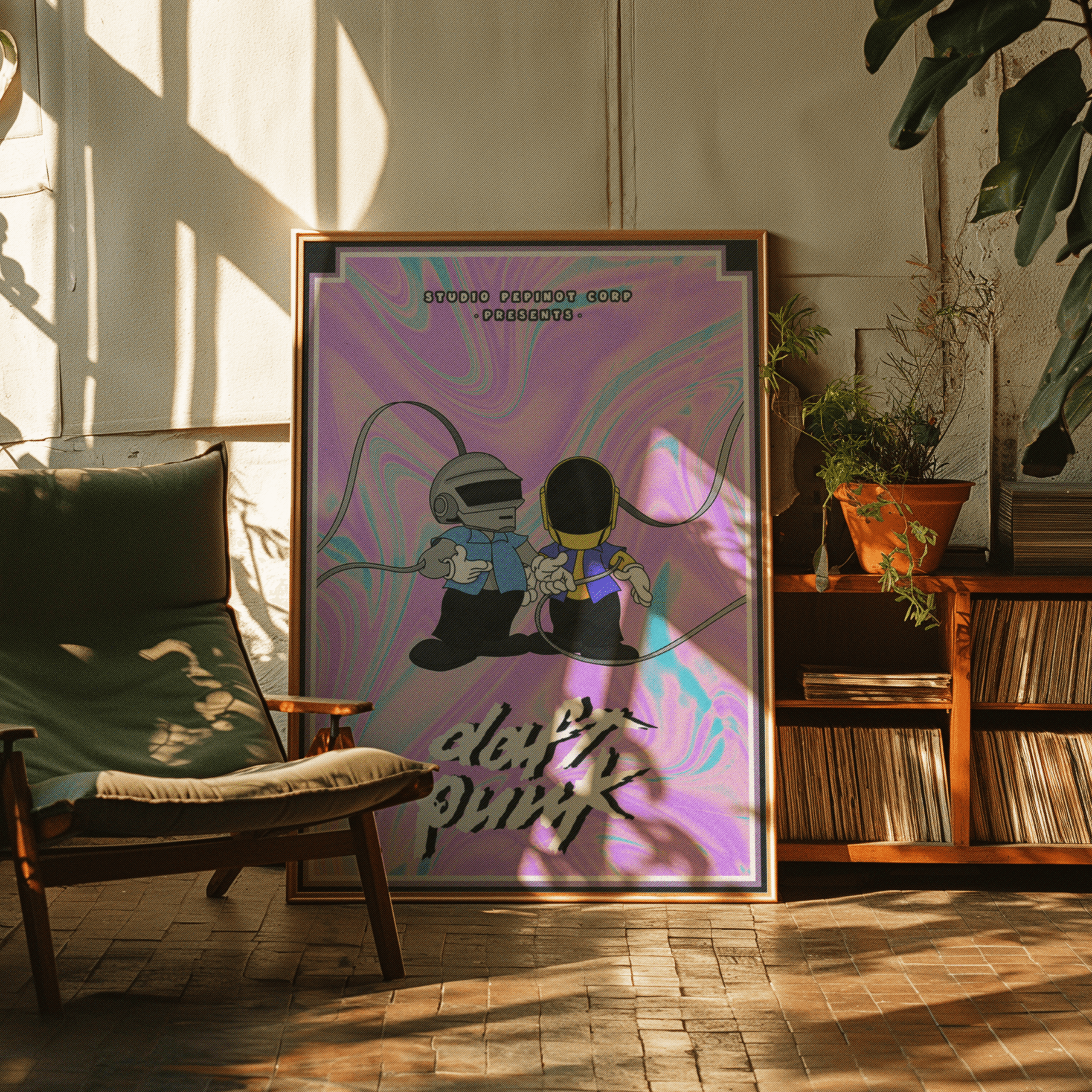 Ce poster moderne et vibrant rend hommage au duo légendaire Daft Punk à travers une interprétation graphique inspirée de l’esthétique pop et rétro. Les célèbres casques de robot du groupe sont réimaginés sous une forme cartoon, avec des personnages stylisés aux vêtements colorés, tenant les câbles qui les relient, évoquant ainsi l’idée de collaboration et de connexion musicale. Le fond, composé d’un dégradé psychédélique aux teintes pastelles de violet, bleu et rose, crée une ambiance à la fois futuriste et nostalgique, qui rappelle les années 90 tout en restant ancrée dans l’univers électronique de Daft Punk. Le titre « daft punk », écrit dans une typographie dynamique et grunge, complète cette approche visuelle en donnant à l’affiche un aspect à la fois énergique et décalé.