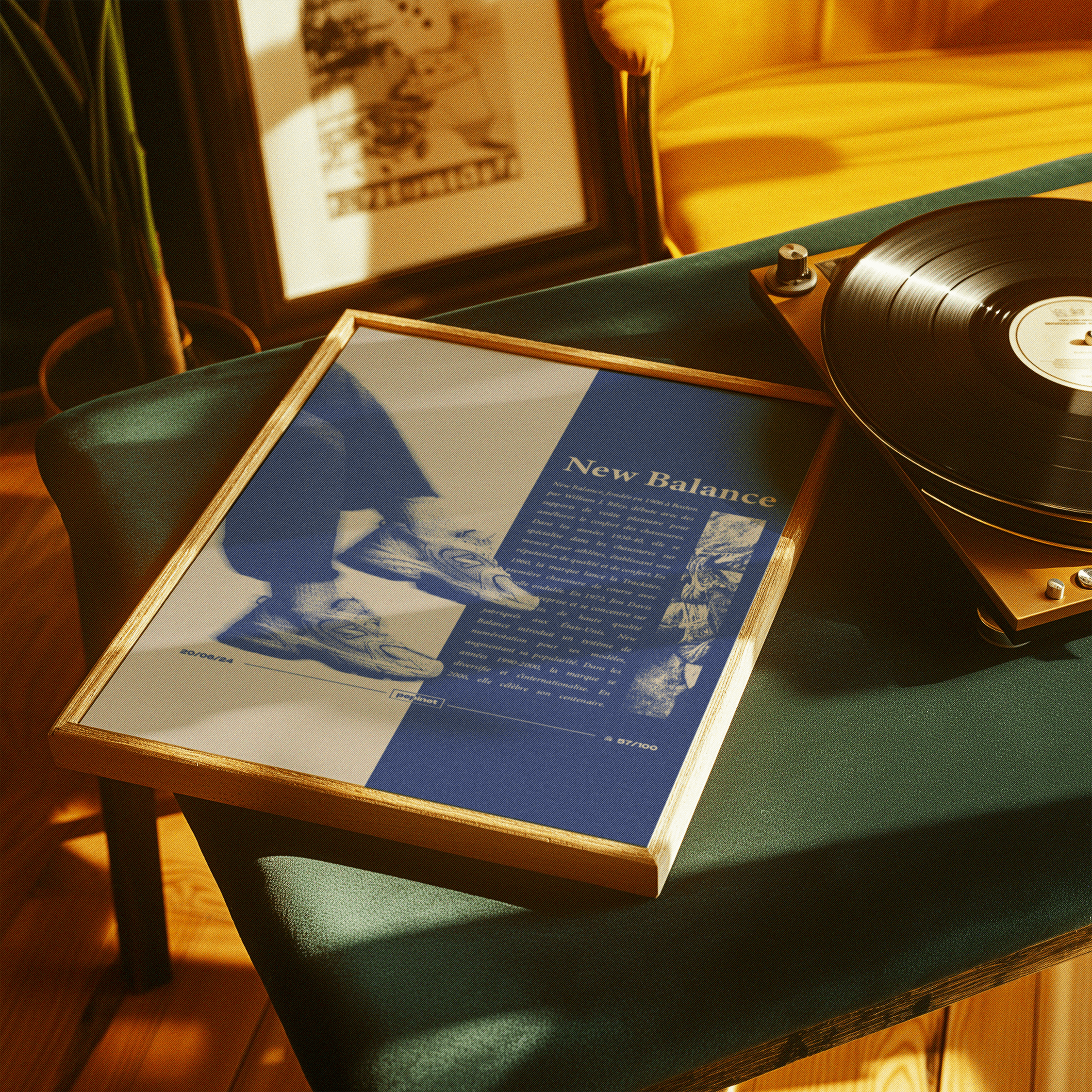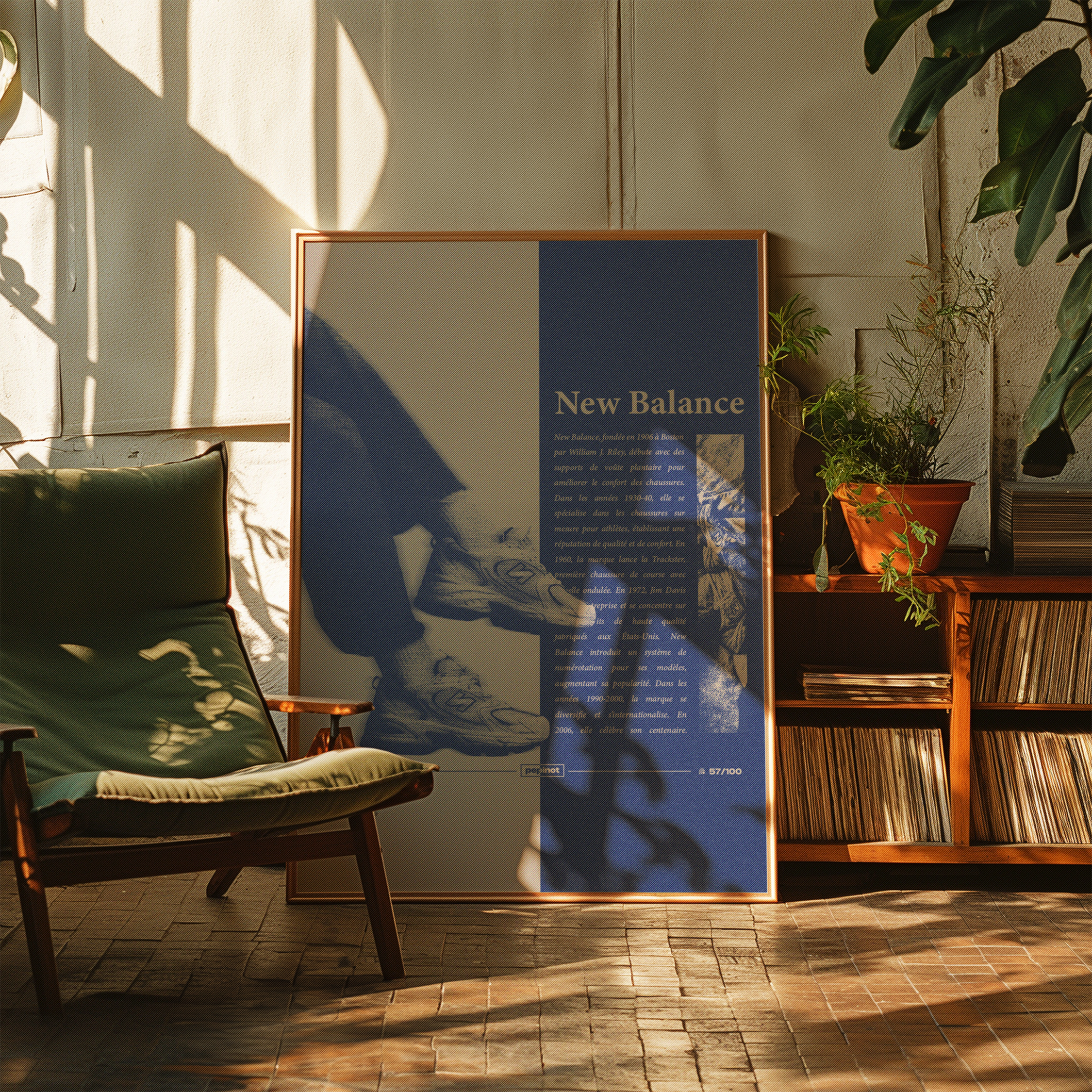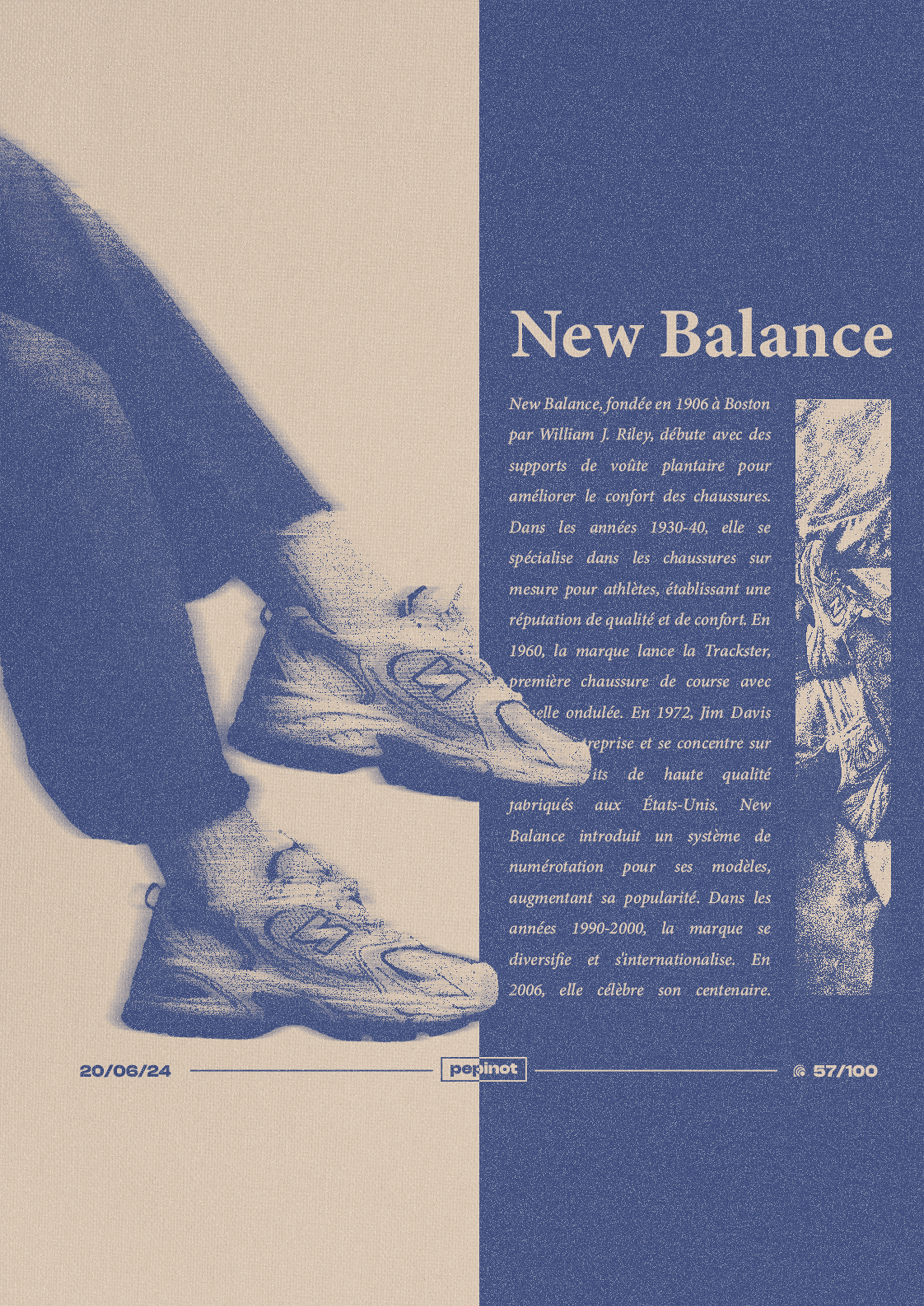 Le poster présente une composition centrée autour des baskets New Balance, avec une touche vintage et une typographie forte, créant un contraste entre les éléments visuels et textuels. L’image de la chaussure est en premier plan, accompagnée de détails en arrière-plan pour renforcer l’idée de mouvement et de sportivité. Le texte est bien organisé, avec un focus sur la marque et son histoire. Le bleu et le beige créent une atmosphère intemporelle, mettant en avant le produit tout en apportant un effet rétro. Enfin, le poster est numéroté « 57/100 », soulignant qu’il fait partie d’un challenge créatif de 100 affiches.