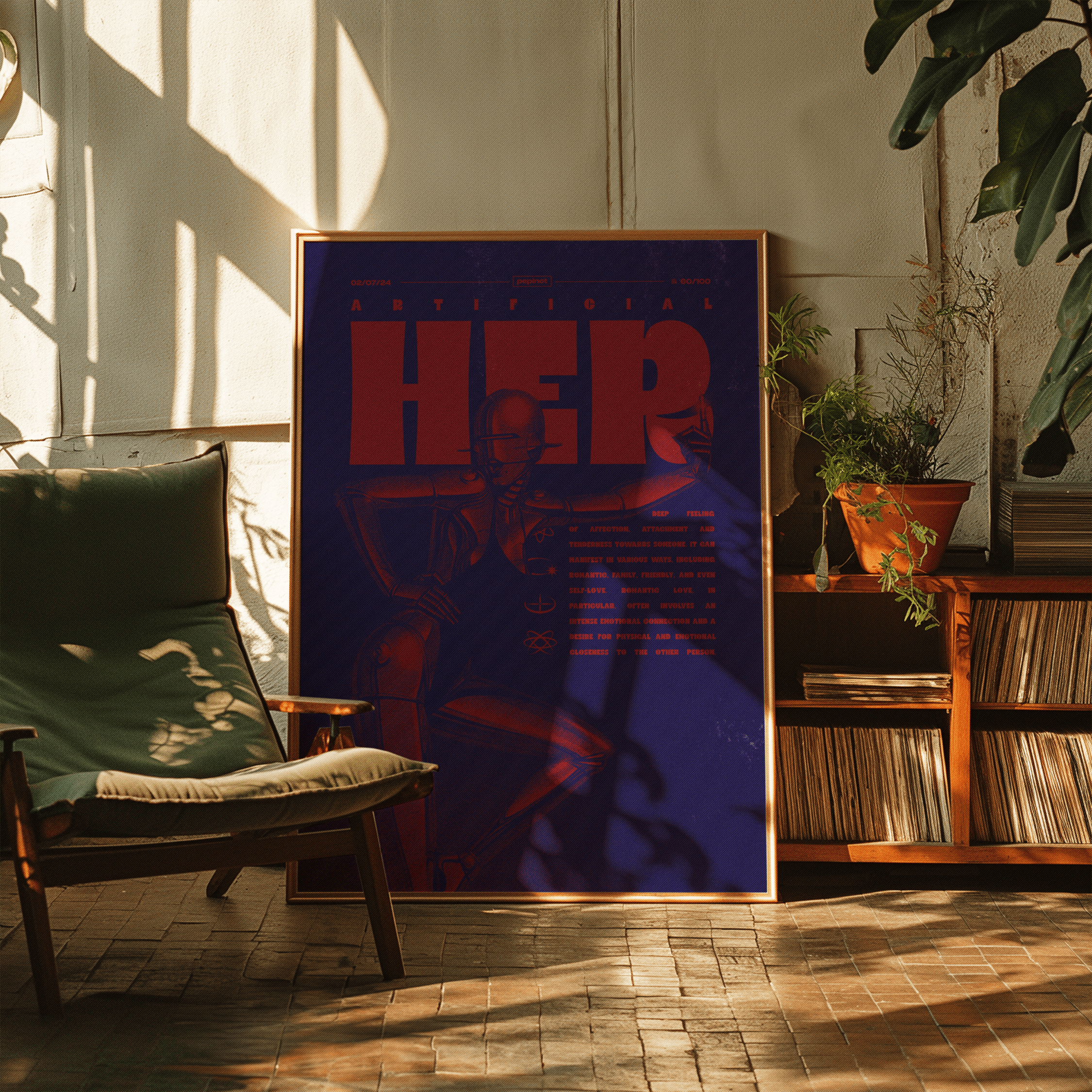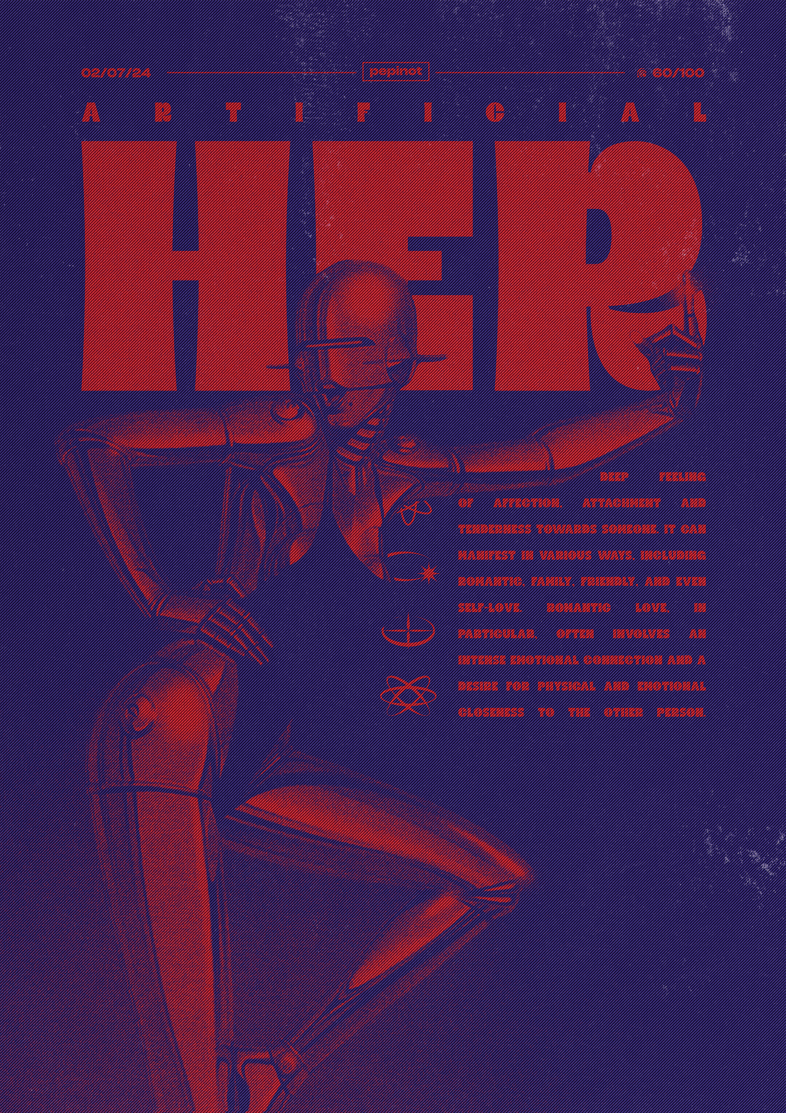 Ce poster met en avant une palette de couleurs vibrantes, dominée par des tons rouges et bleus qui créent un contraste saisissant. La figure centrale, un robot stylisé, renforce l’aspect artificiel et futuriste, en lien avec le titre « Artificial ». Le texte, très imposant et surdimensionné, occupe la majeure partie du visuel et est agencé de manière à marquer une hiérarchie visuelle forte. Le choix d’une typographie large et sans-serif amplifie l’effet de puissance et de modernité. Le slogan et les symboles placés à côté ajoutent une dimension explicative tout en renforçant l’univers scientifique et technologique de l’affiche. Le numéro 60/100 fait partie du challenge des 100 posters.