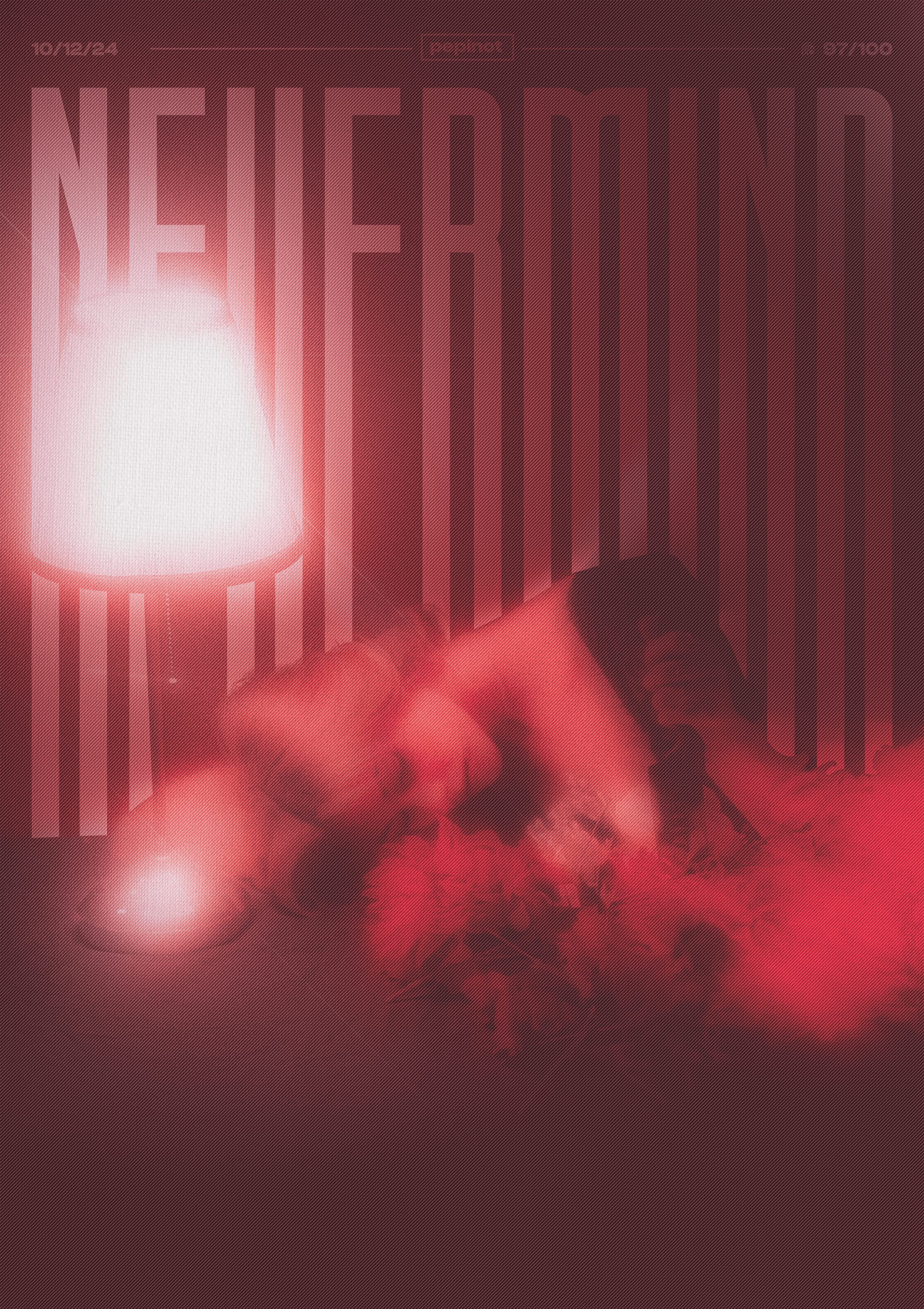 Le poster dégage une atmosphère sombre et mélancolique, où les ombres et la lumière sont utilisées pour exprimer le regret et la déception. La lumière rouge qui éclaire la scène symbolise la douleur et la perte. La silhouette d’une femme, légèrement floue et baissée sous le poids de ses émotions, évoque un sentiment de solitude et de résignation. Le contraste entre la chaleur de la lumière et l’isolement visuel de la personne renforce l’idée qu’elle est à un moment de réflexion intense, marqué par un sentiment de défaite. Le titre « NEVERMIND » ajoute une touche de fatalisme, suggérant que malgré la situation, la femme semble accepter l’inéluctabilité de sa déception.