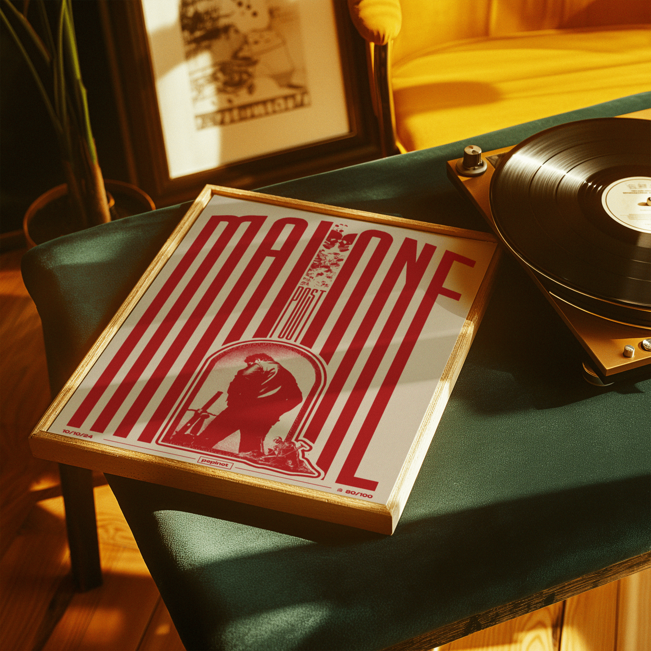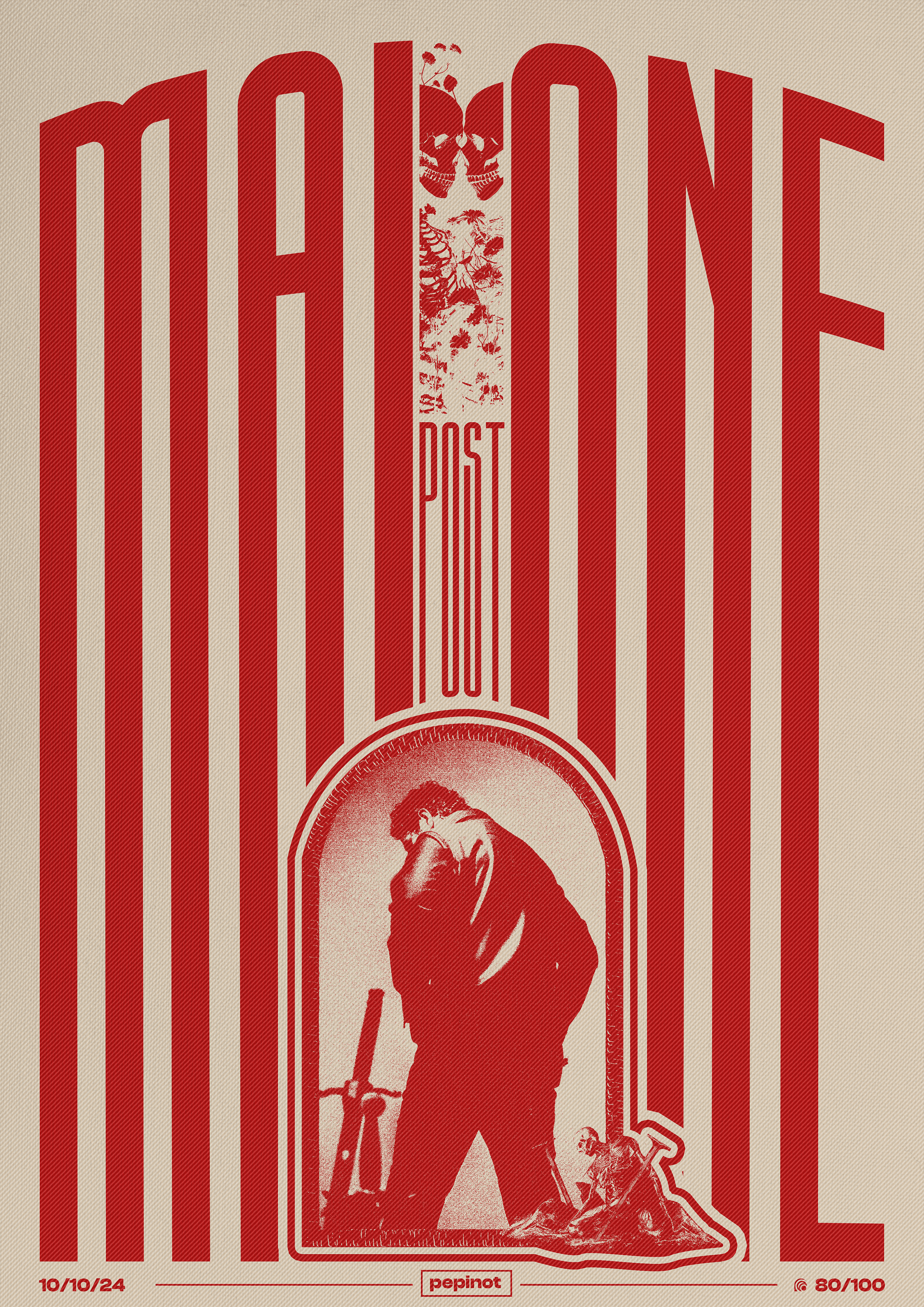 Le poster présente une composition visuellement percutante où le texte MALONE domine, avec une typographie audacieuse et étroite qui occupe presque toute la largeur de l’affiche. L’utilisation de rayures rouges et blanches sur un fond beige renforce l’aspect graphique et moderne. Au centre, une image en rouge du portrait de Post Malone est encadrée par une forme en arc, accentuant le focus sur l’artiste. La mention POST est placée à l’intérieur d’un espace vertical, créant un contraste avec l’image plus statique. Le numéro 80/100 se trouve discrètement en bas, suivant le style du poster. L’ensemble crée une dynamique visuelle forte, tout en restant fidèle à l’univers graphique de l’artiste.