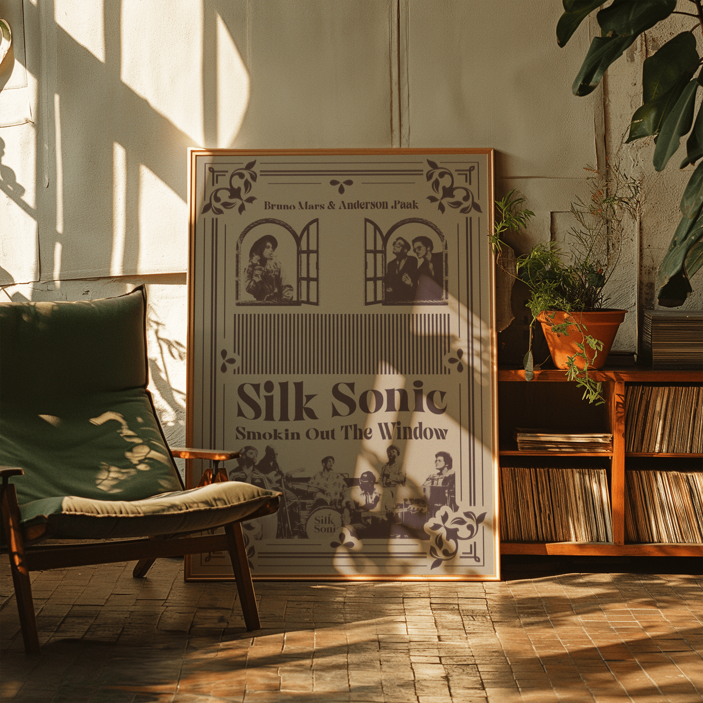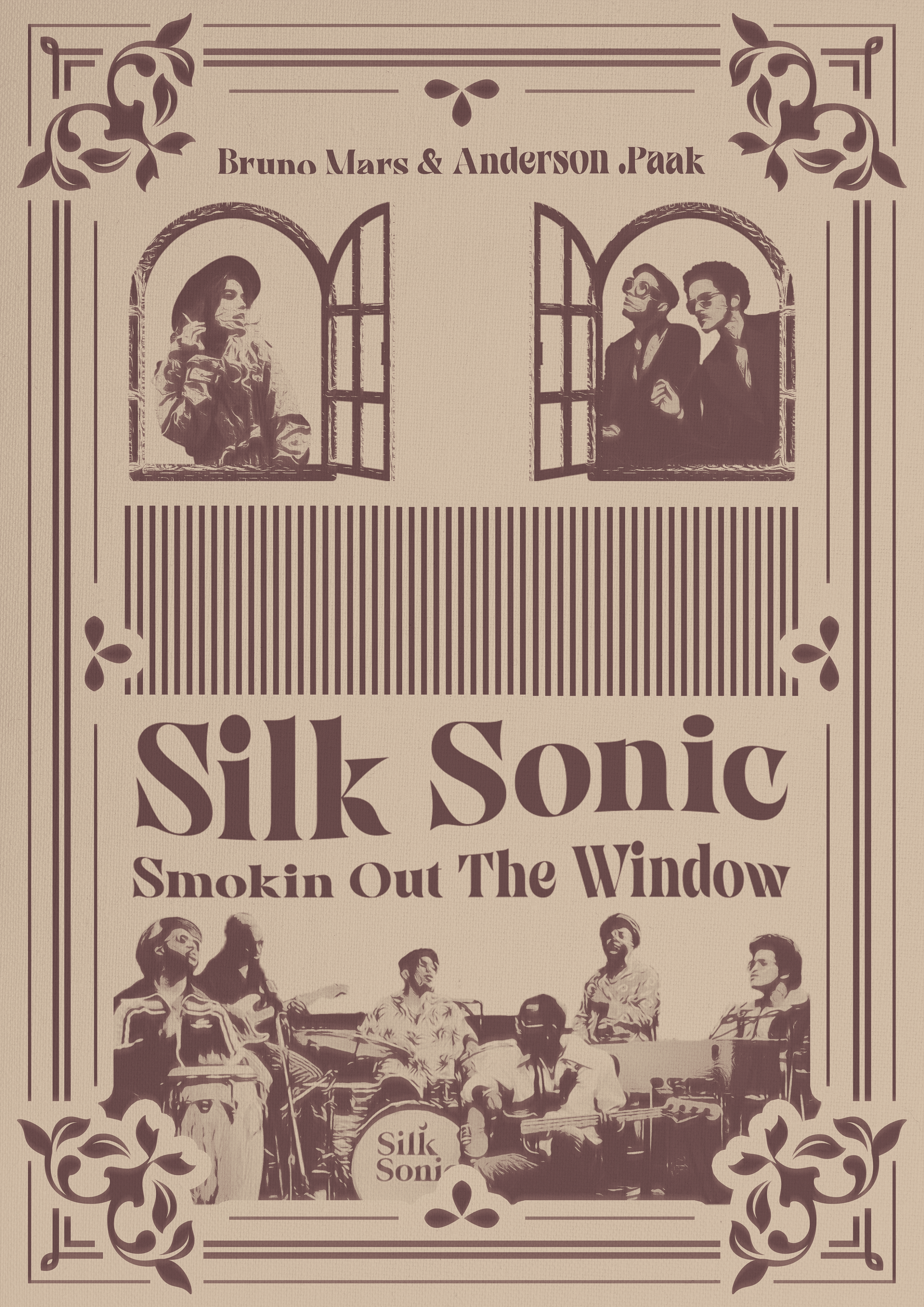 Le poster s’inspire de l’esthétique vintage, rappelant les affiches des années 60-70, avec des couleurs sépia et un design structuré autour de fenêtres en perspective. La typographie choisie pour « Silk Sonic » reflète ce côté rétro, avec des caractères fins et élancés, tandis que les images de Bruno Mars et Anderson .Paak en fond créent une ambiance intimiste. Le numéro 65/100 rappelle le challenge des 100 posters.