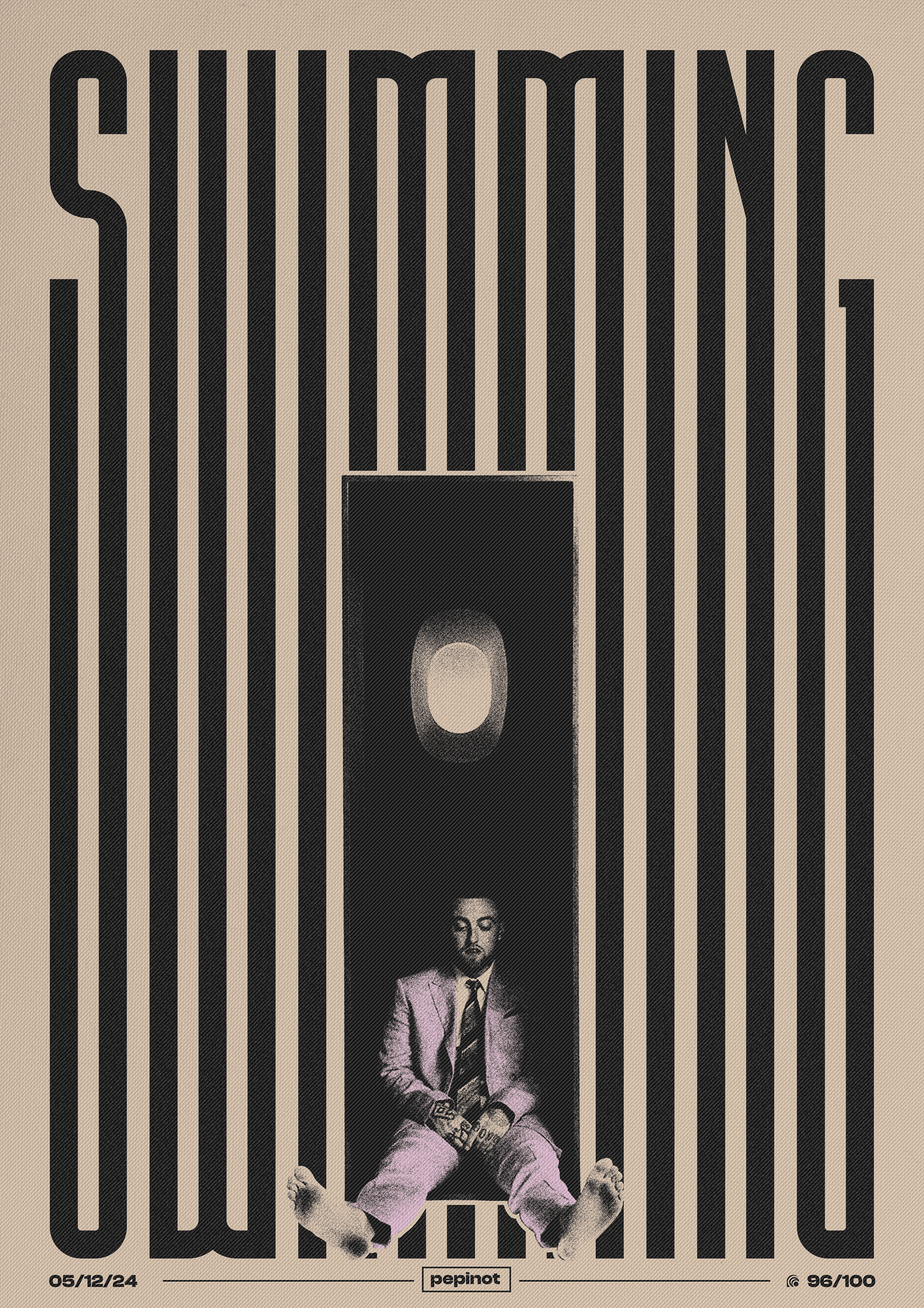 Ce poster rend hommage à Mac Miller avec une approche minimaliste et visuellement frappante. Les bandes verticales noires, qui s’étendent du haut vers le bas, créent une sensation de confinement, en écho à l’émotion et à la profondeur de l’album « Swimming ». La silhouette de Mac Miller, assis dans un espace étroit et baigné d’une lumière douce, accentue cette atmosphère de solitude et de réflexion. L’utilisation du noir et du beige fait ressortir la mélancolie et la profondeur de l’instant. Le titre « SWIMMING » prend toute la place, évoquant un sentiment d’isolement tout en rappelant la lutte intérieure. La simplicité du design fait ressortir la beauté de l’hommage à un artiste qui, malheureusement, est parti trop tôt.