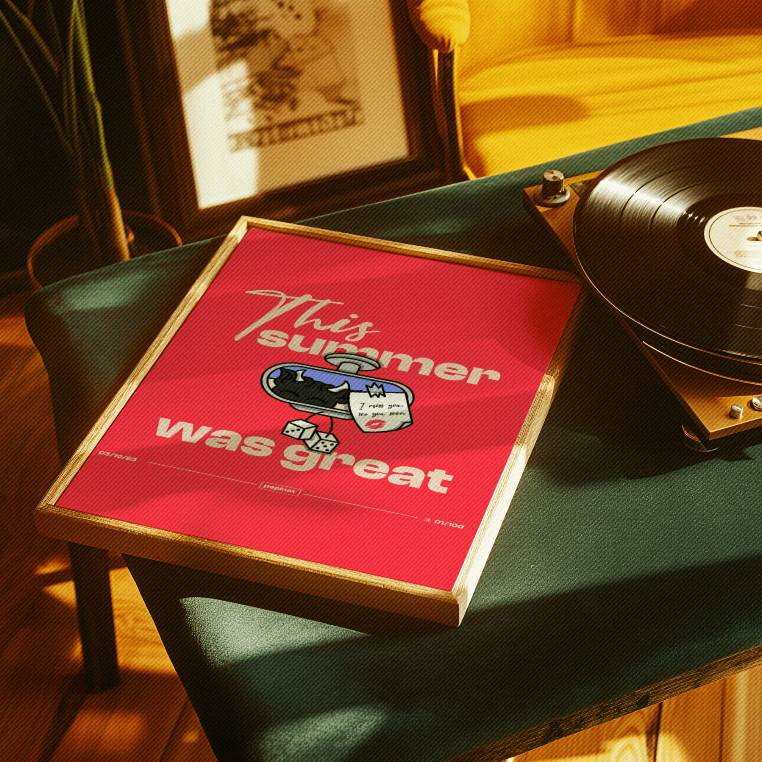 Ce poster dynamique et moderne marque le début d’un challenge de 100 posters, avec l’indication « 01/100 » en bas, soulignant qu’il s’agit du premier poster de ce projet. L’illustration présente un personnage espiègle, un petit démon, dans une bouteille, accompagné de dés et d’un message tendre « I miss you, see you soon » sur un papier, rappelant les souvenirs d’un été inoubliable. Le fond rouge vif et la typographie audacieuse « This summer was great » créent un contraste visuel fort, tandis que l’ambiance générale transmet une sensation de fun et de légèreté. Ce poster, avec sa touche ludique et ses couleurs vives, inaugure ce challenge créatif de manière énergique et mémorable.