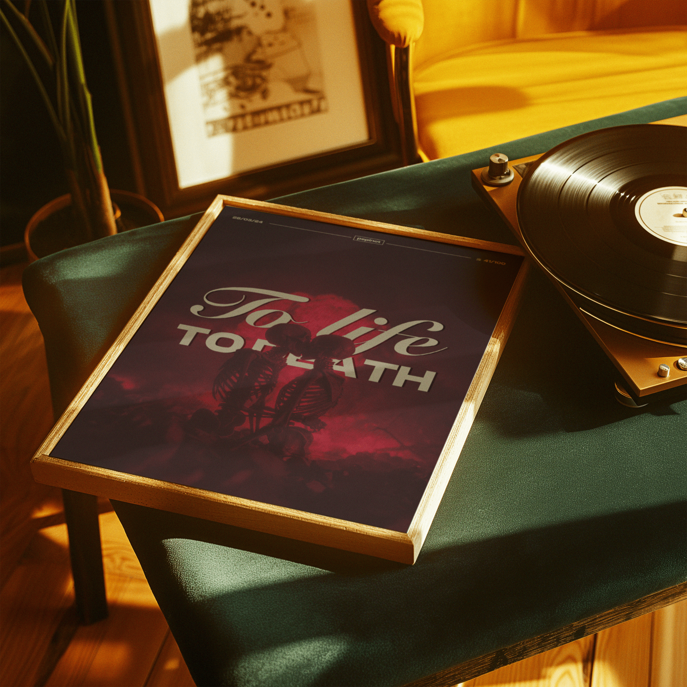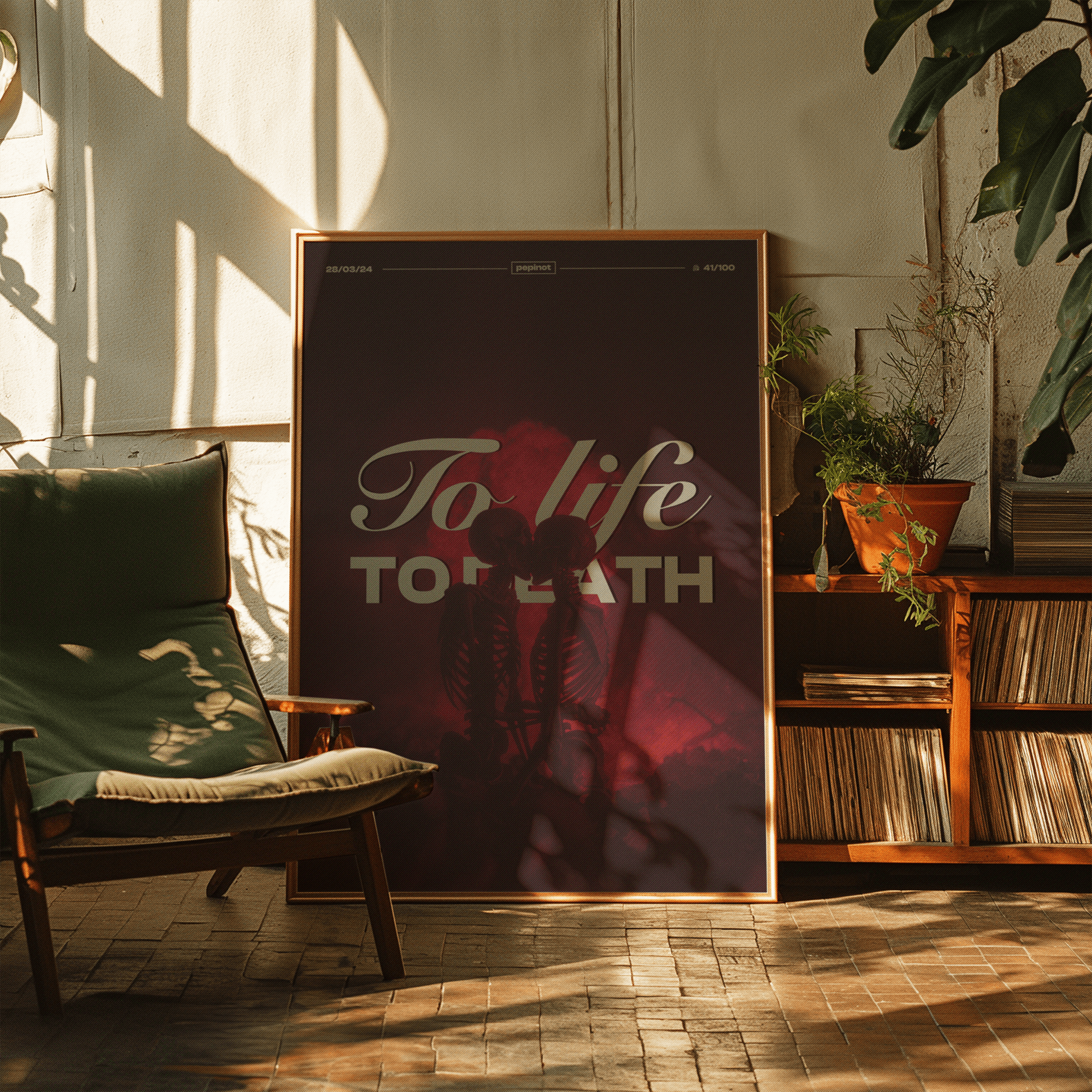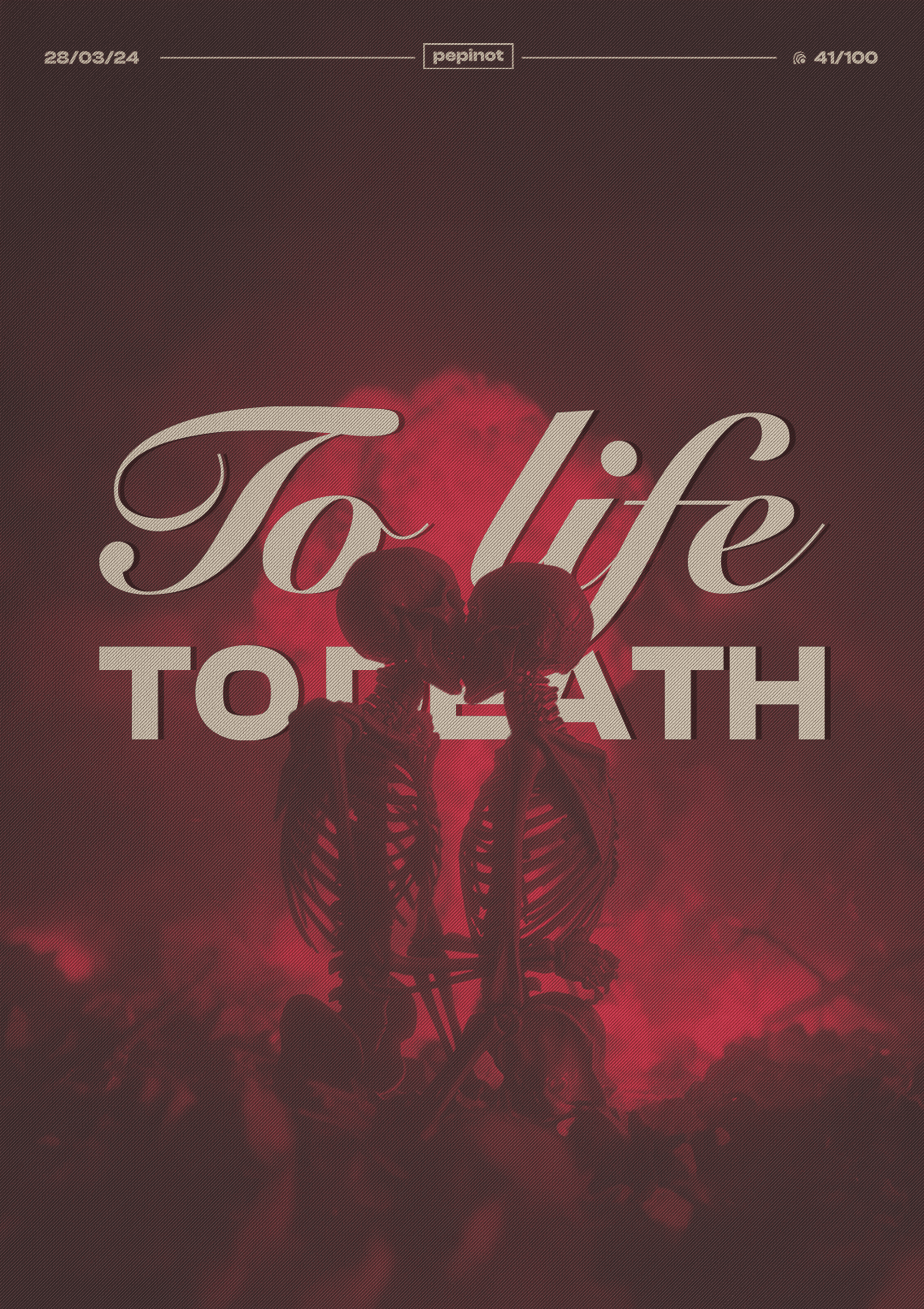 Ce poster visuellement saisissant, le 41ème du challenge de 100 posters, explore la dualité entre la vie et la mort à travers une scène puissante et symbolique. Deux squelettes, enlacés et s’embrassant, figurent au centre de l’image, incarnant l’idée de l’amour éternel malgré la mortalité. Le contraste entre les figures décharnées et le fond rouge intense, presque surnaturel, renforce l’intensité de la scène. Le titre « To life, TO DEATH », en typographie mixant l’élégance du texte fluide et la force du lettrage large, occupe une place centrale, accentuant l’ampleur du message. Le visuel évoque un profond engagement envers les contradictions de l’existence humaine, dans un contexte presque mystique.